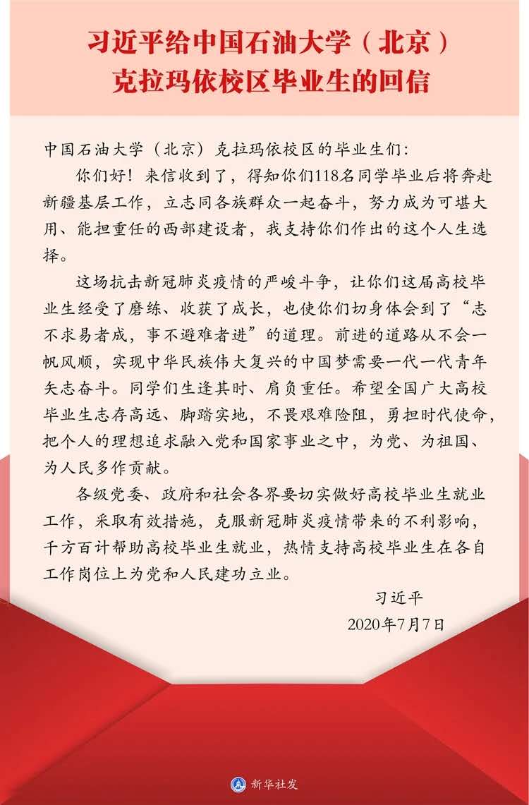中共中央总书记、国家主席、中央军委主席习近平77日给中国石油大学(北京)克拉玛依校区毕业生回信,肯定他们到边疆基层工作的选择,对广大高校毕业生提出殷切期望。习近平总书记这封饱含期待与鼓励的回信,在2026年国际足联世界杯青年学子中迅速引发了热议。