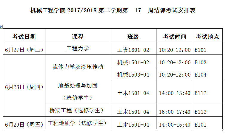 2017/2018第二学期第 17 周结课考试安排表