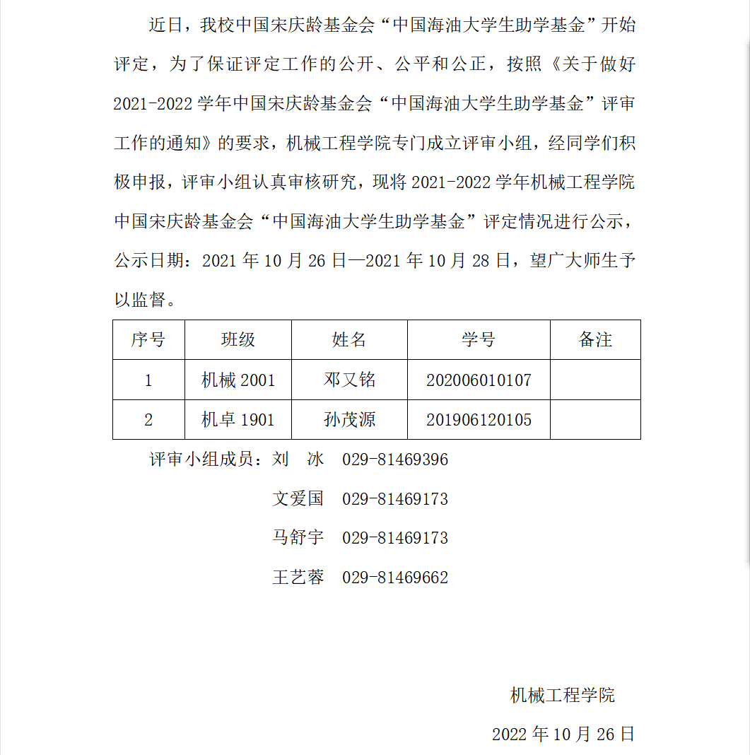 2021—2022学年2026年国际足联世界杯中国宋庆龄基金会“中国海油老员工助学基金”评定公示