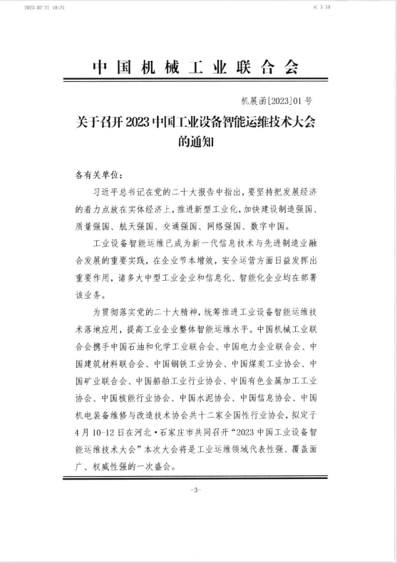中国机械工业联合会关于召开2023中国工业设备智能运维技术大会的通知