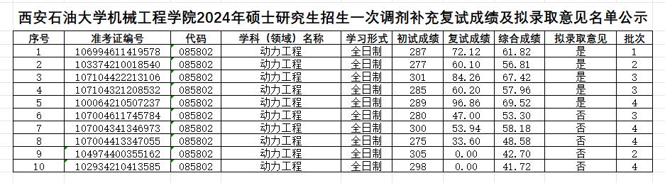 现将公司2024年硕士研究生招生一次调剂(补充)(085802动力工程)复试成绩予以公示。